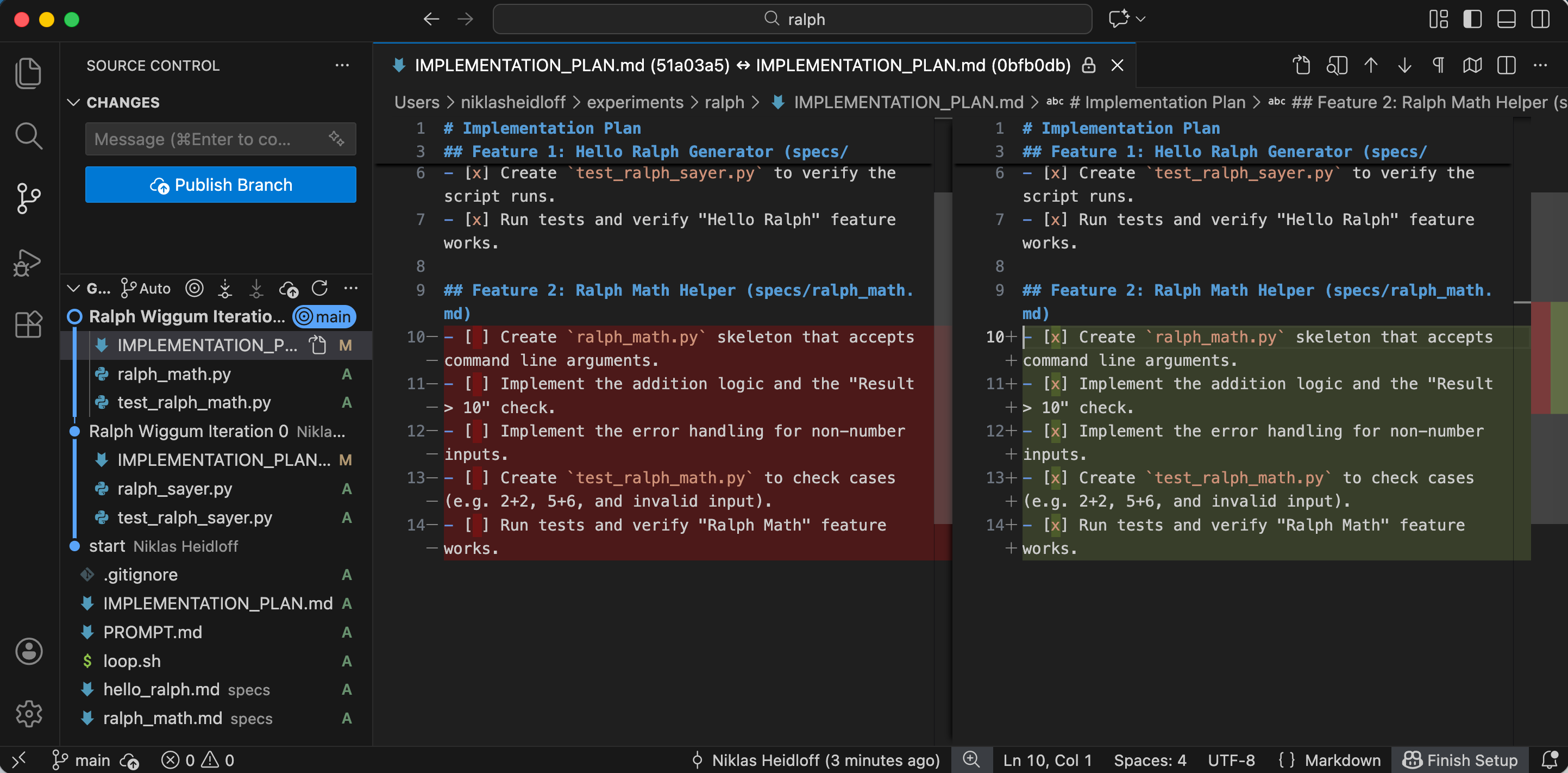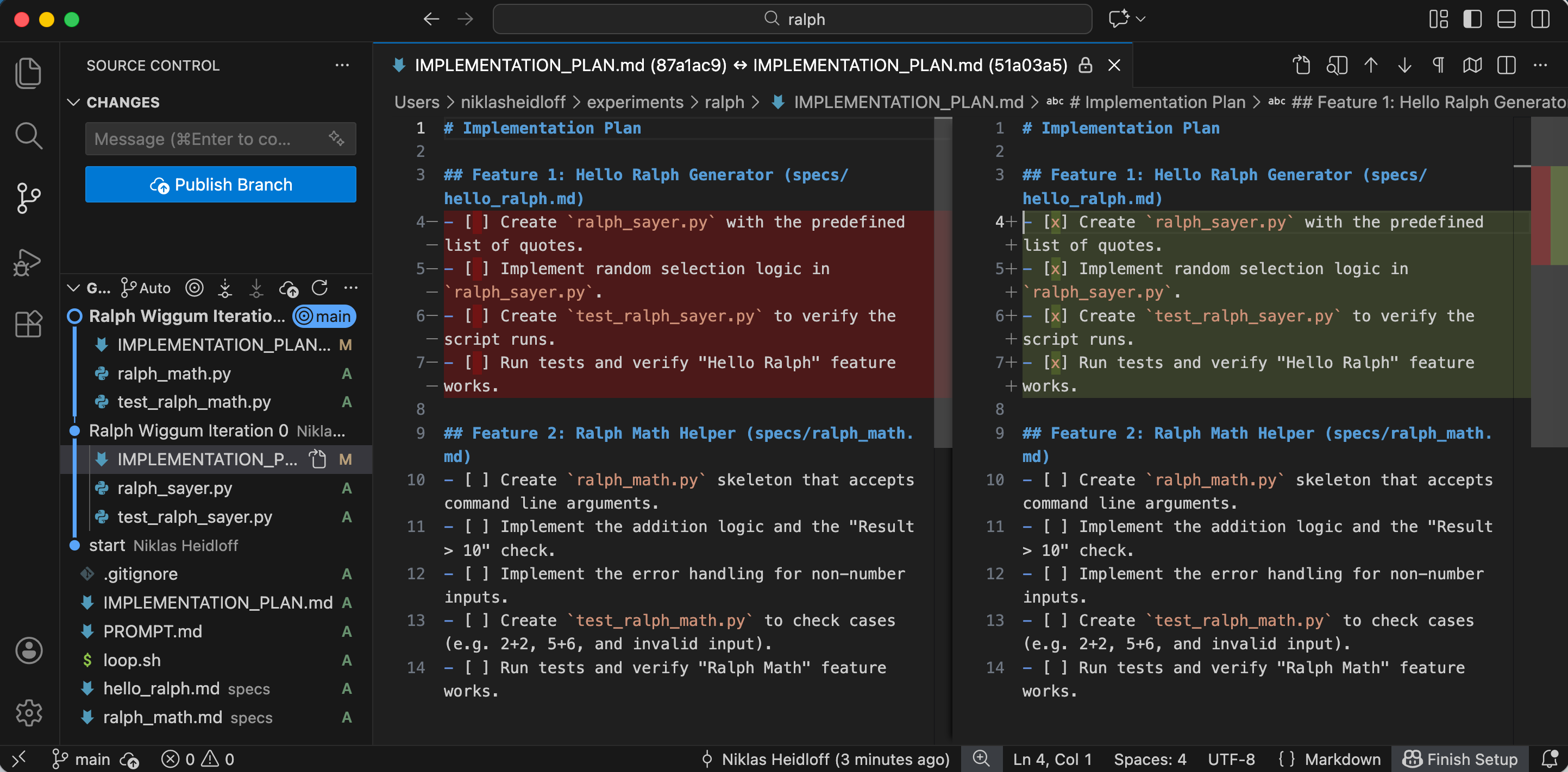 The prompt is important. Bob is asked to read the specifications, the implementation plan and its status and then Bob decides which feature or sub-feature(s) he wants to work on next.