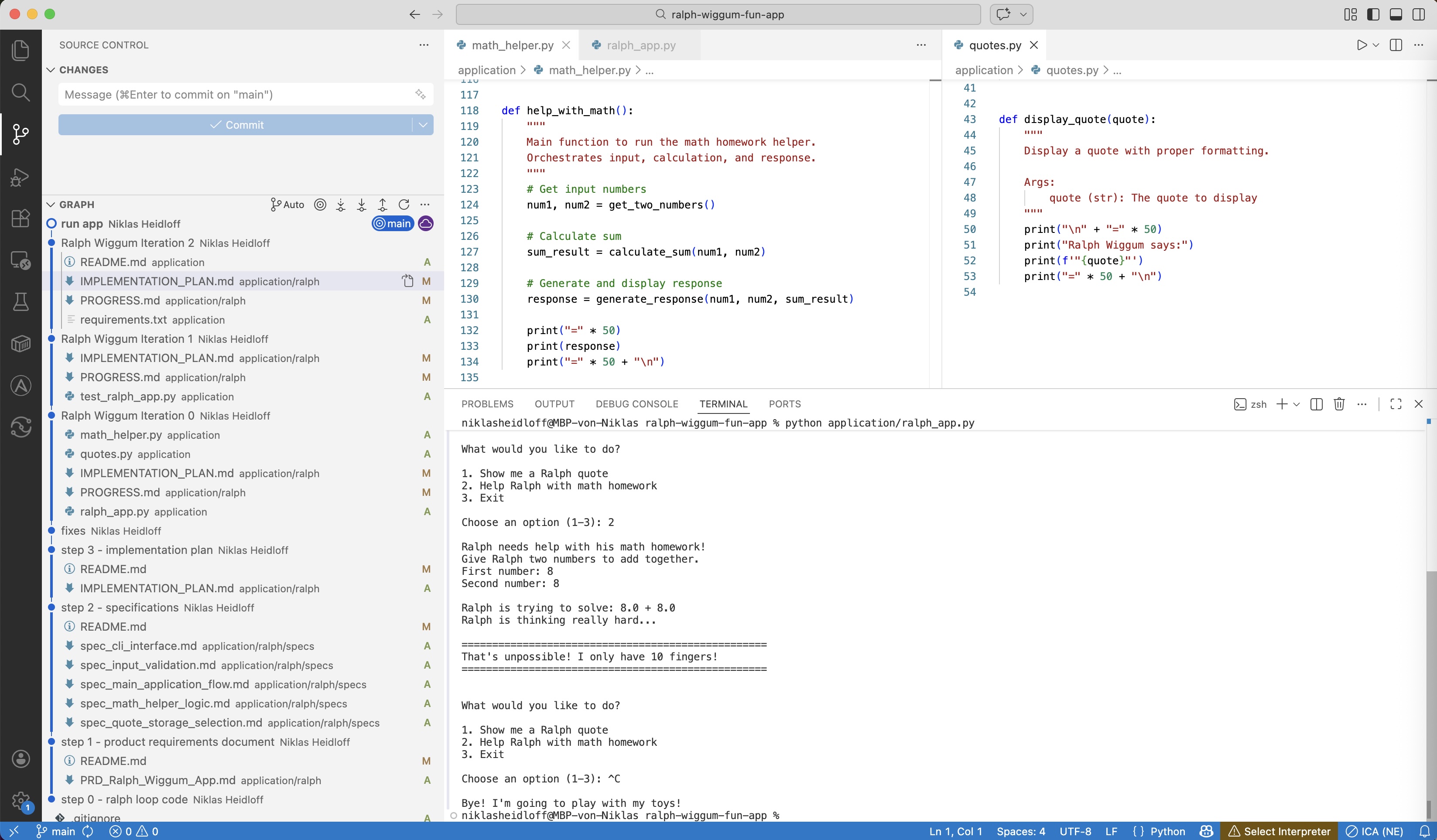 A complete sample implementation is available on GitHub. Reviewing the Git history reveals the different stages of the loop in action. The example is a simple Python application that generates Ralph Wiggum quotes and performs calculations as Ralph would.