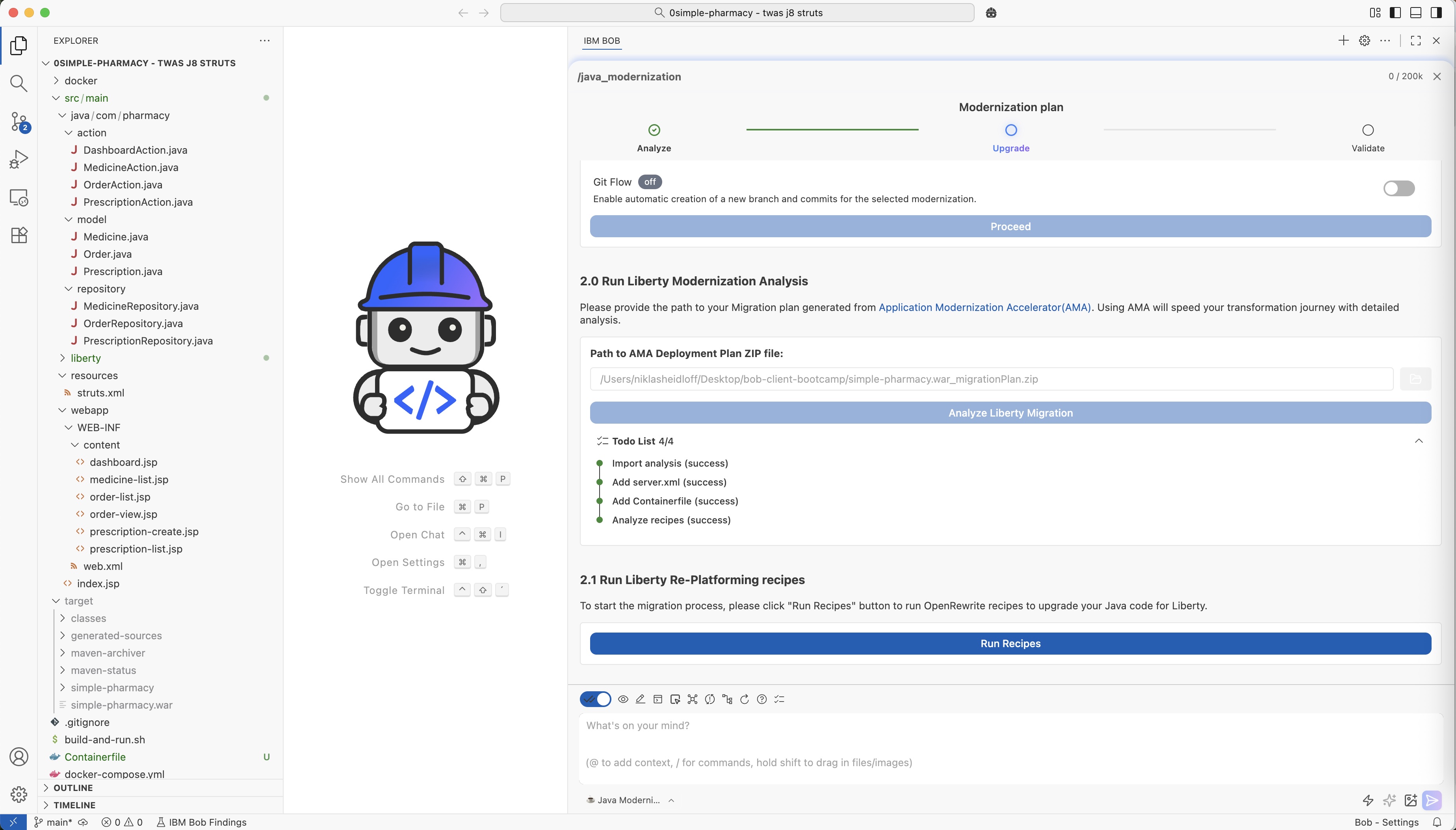 In my case the modernized application didn’t come up. Bob detected this issue when running the last ‘Validate’ stage to run the application. Based on this error, he even updated his Todo list.