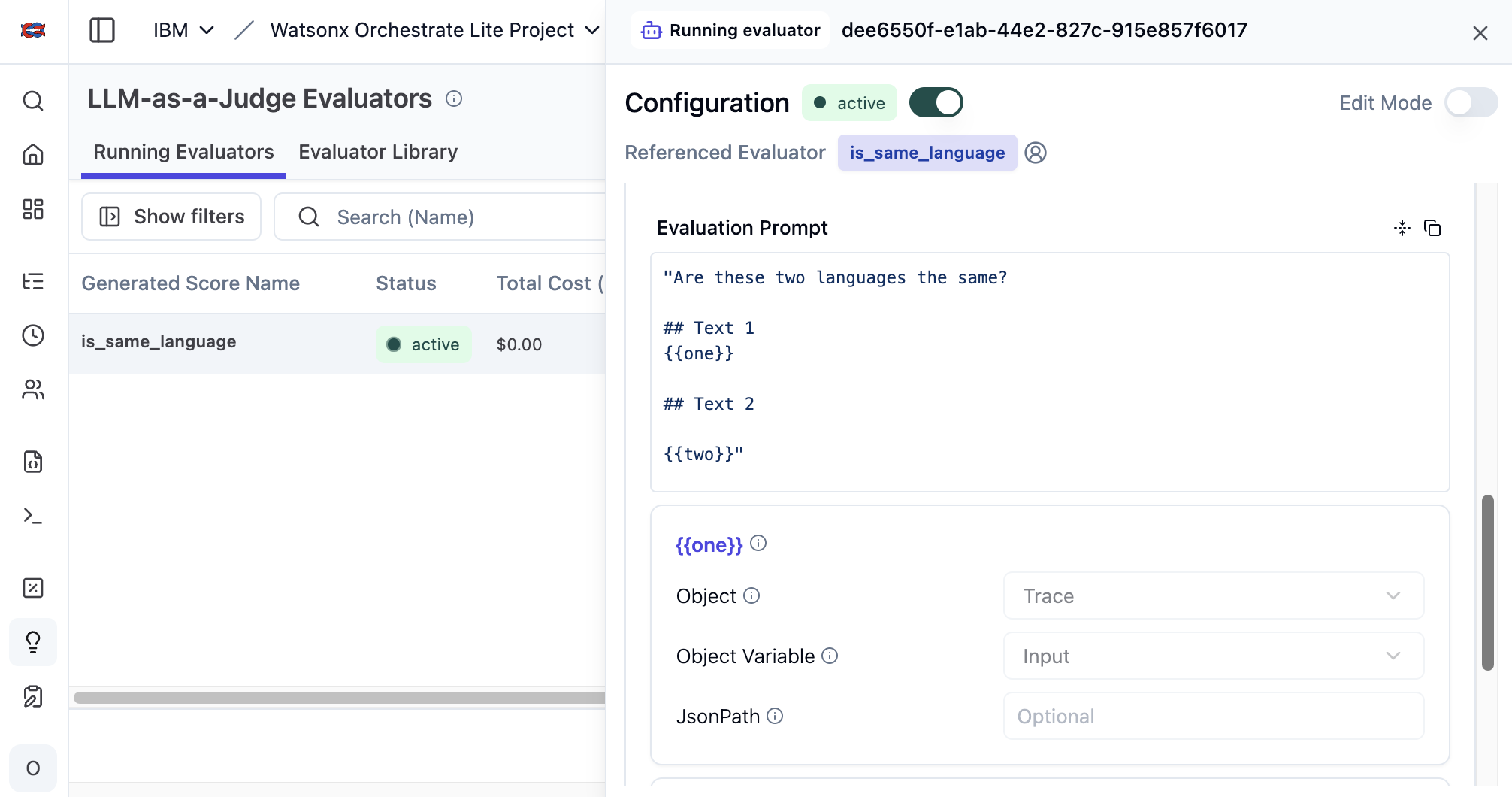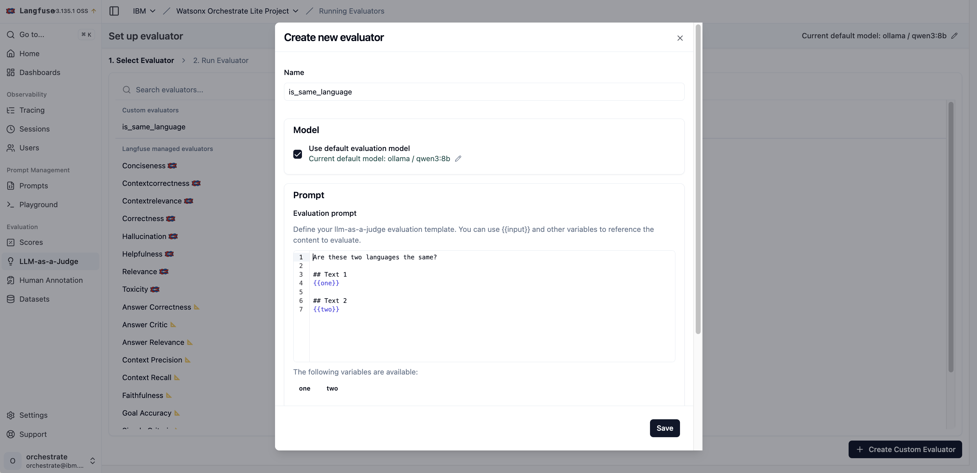 As shown in the image at the top of this post, custom evaluators can be defined, simply by using prompting. The example prompt compares whether the language of the input is the same one as the language of the output.