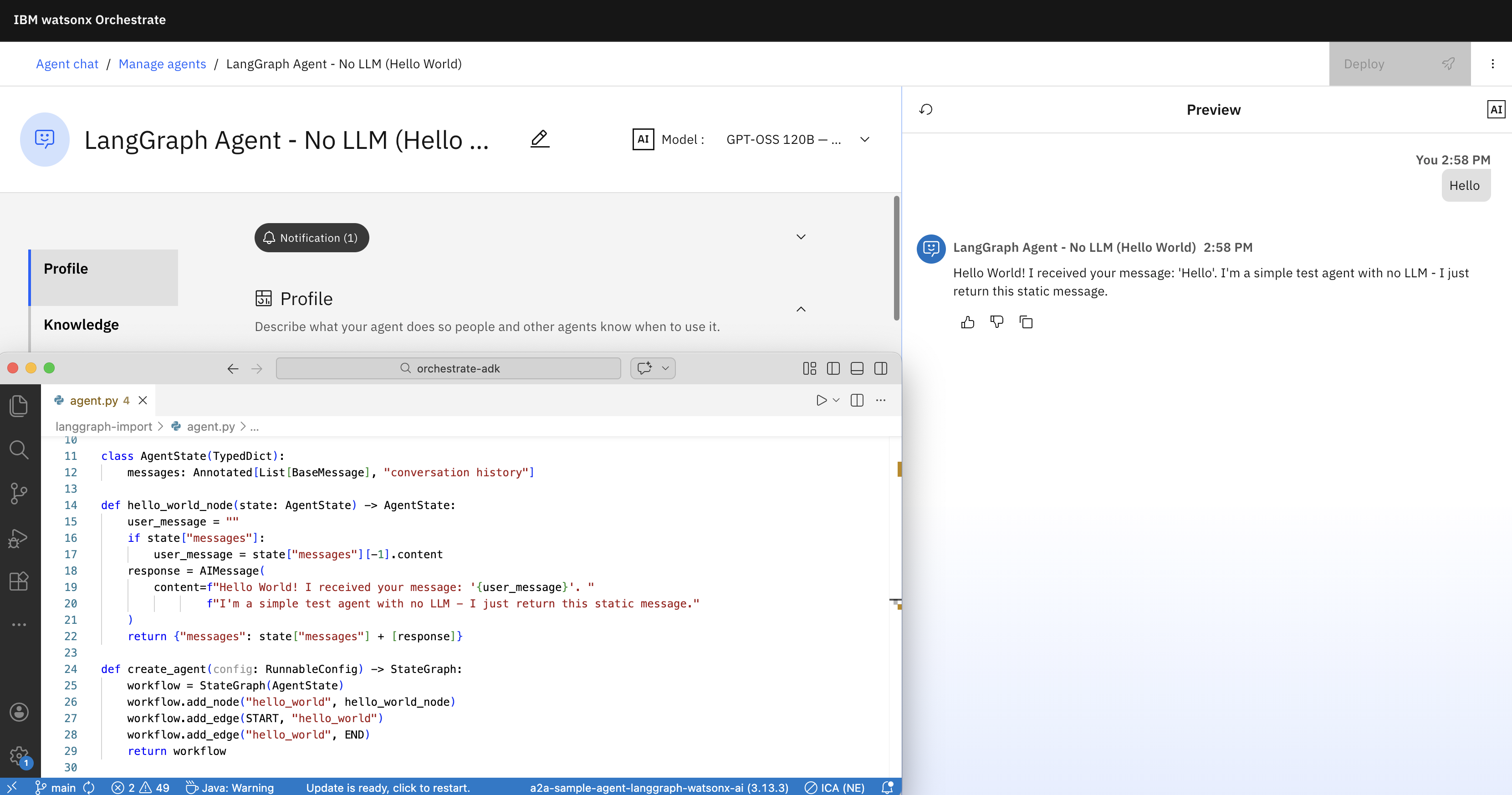 While you don’t have to write A2A wrappers, A2A is used internally in Orchestrate to integrate these imported LangGraph Python agents. To debug issues, you can invoke the following command: