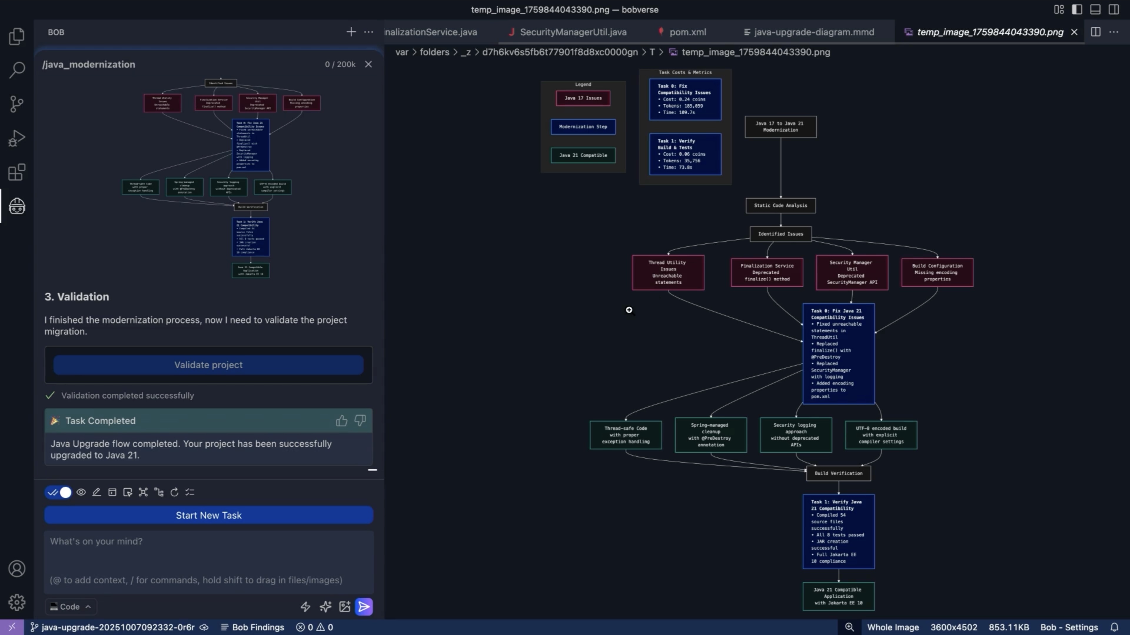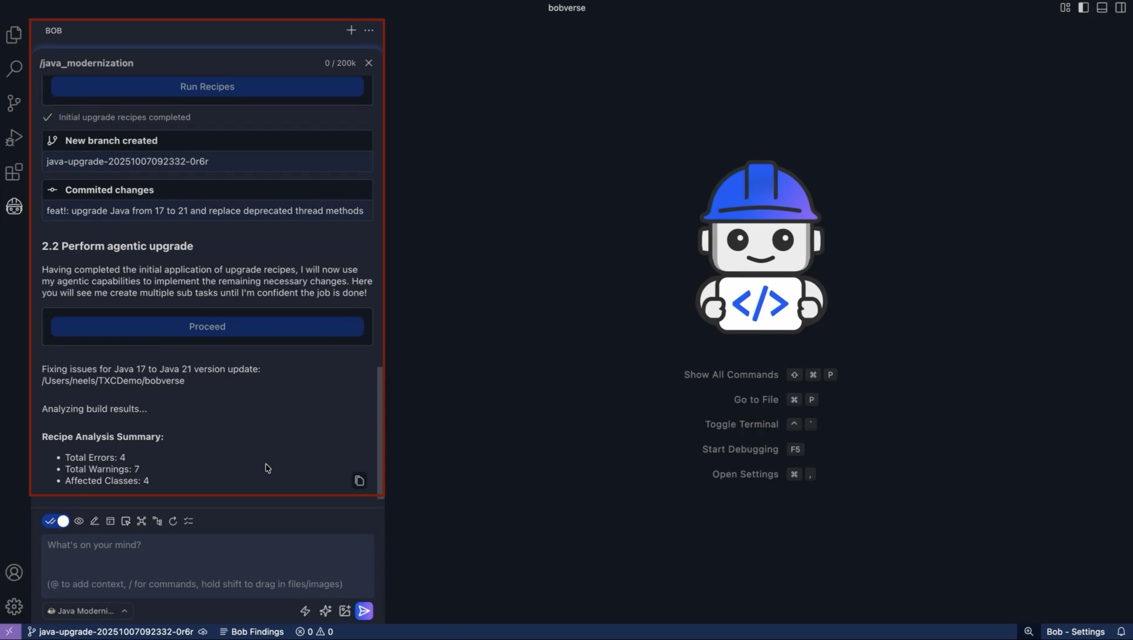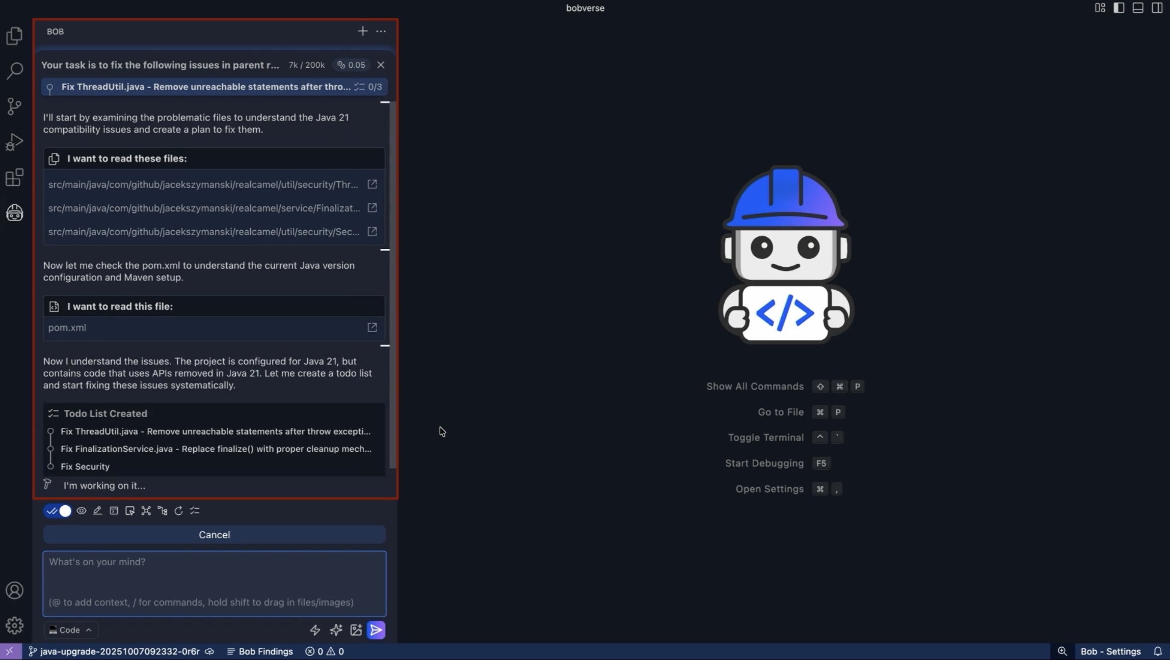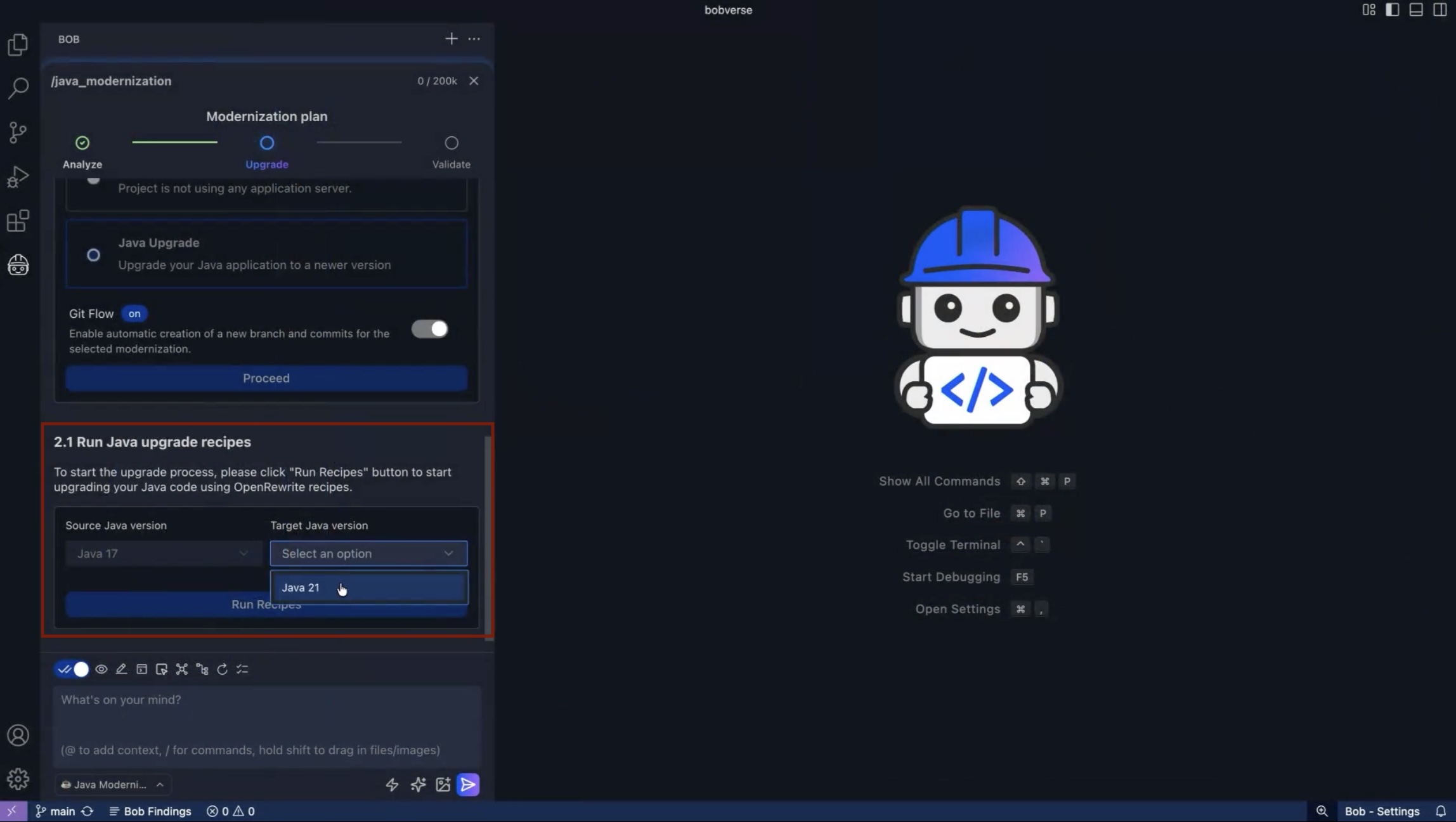 - Purpose built for modernization: Bob specializes in making the hard problems easy. Whether you’re re-platforming an app or helping deliver the next feature, it brings modernization expertise directly into the developer’s workflow.