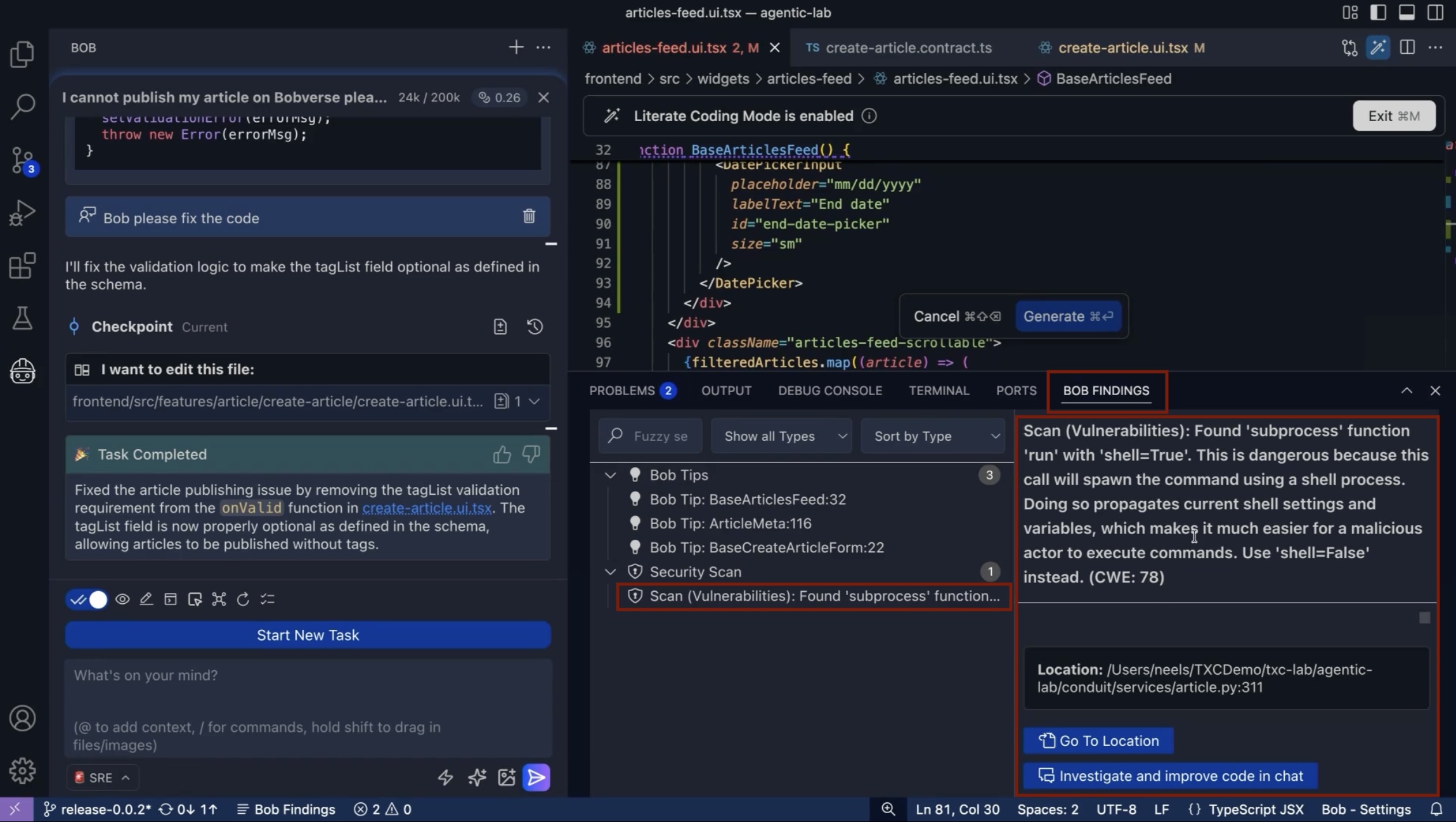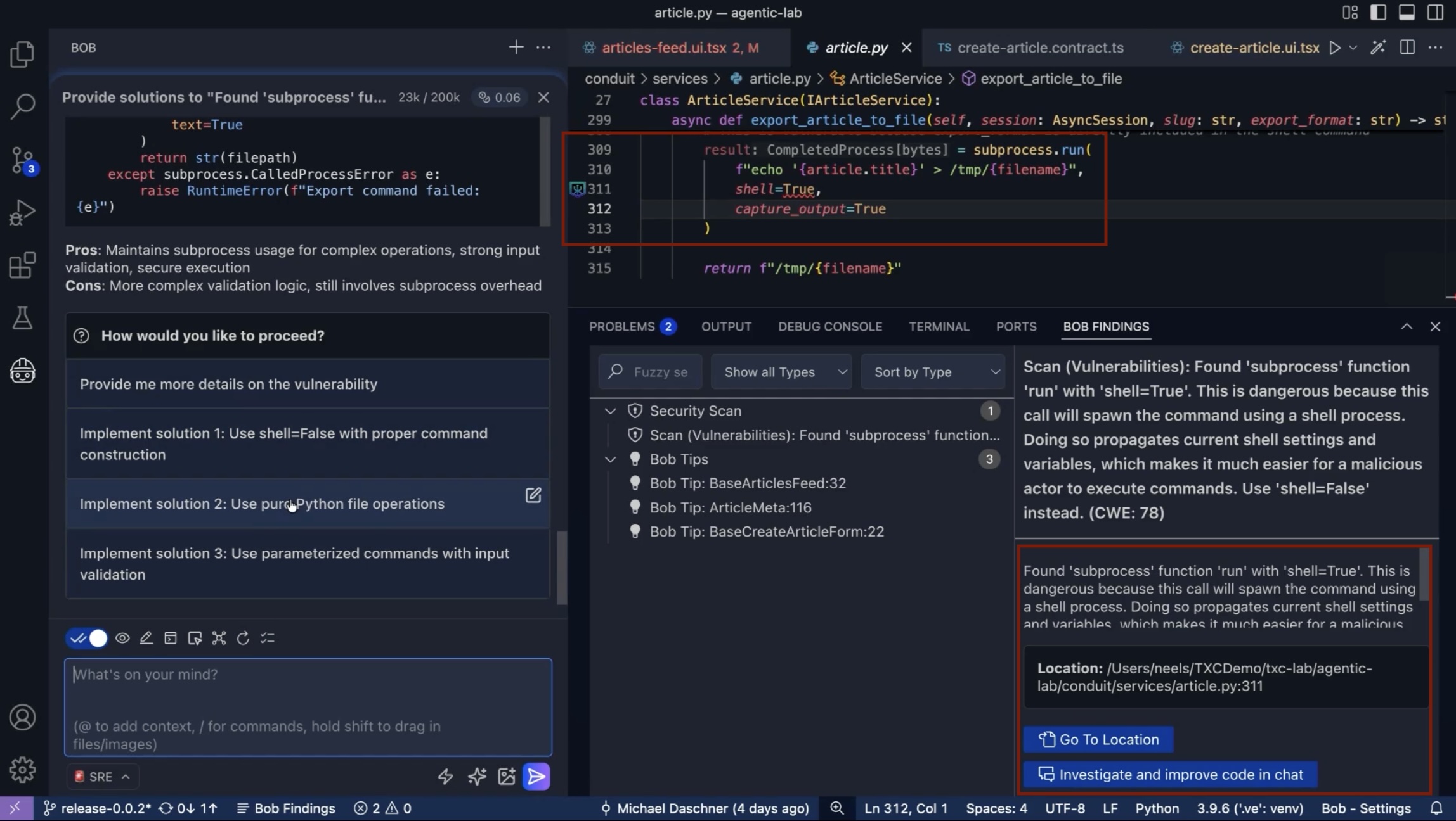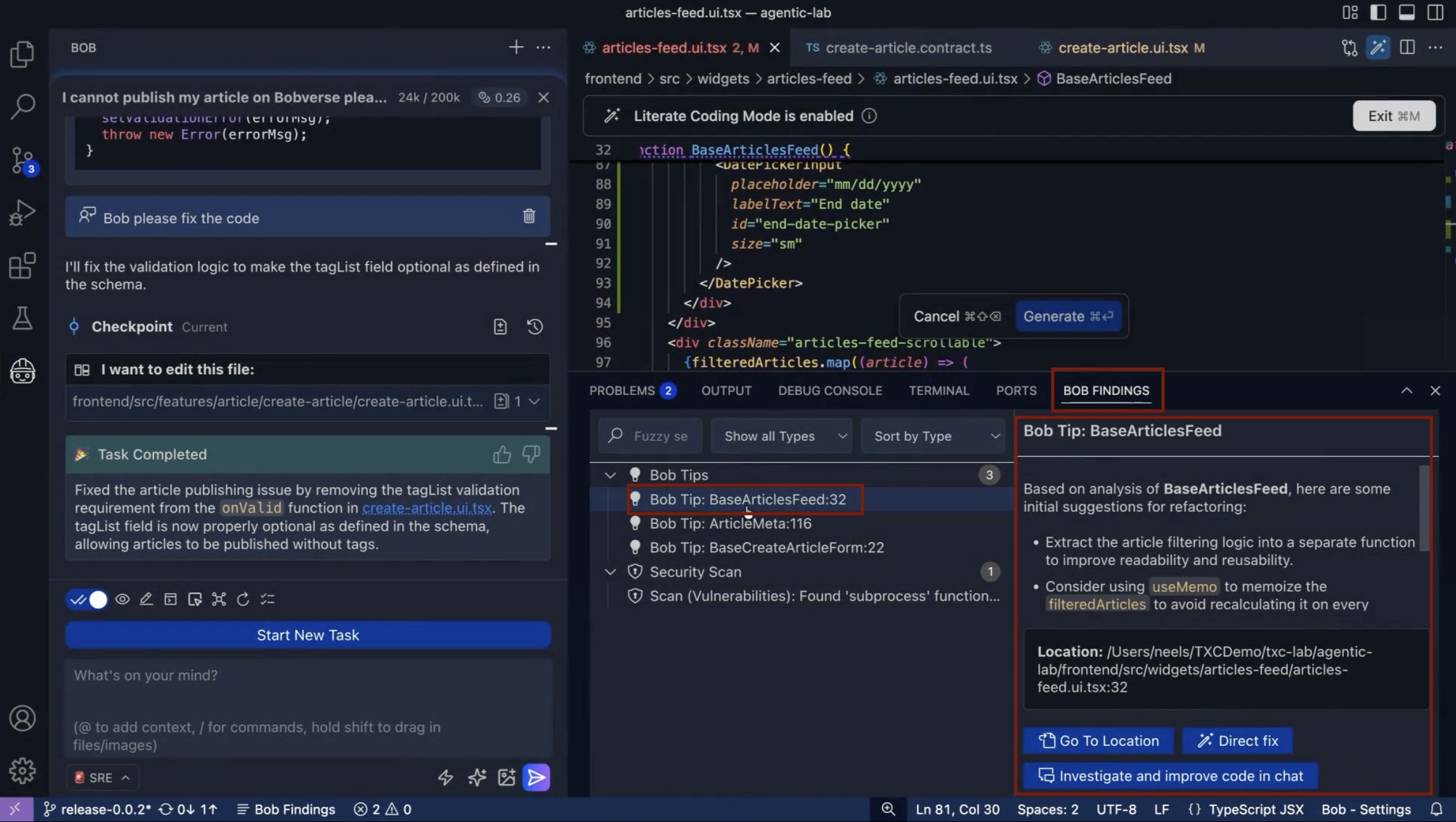 In addition to user interactions project Bob analyzes code in the background and provides a tab with findings and recommendations.